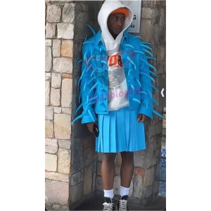 He was captured dressed in a blue jacket with a matching skirt as he performed to the delight of his fans.