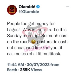 He wrote, “People too get money for Lagos!! Why is there traffic this Sunday morning? So many cars on the road. Pastors de cash out shaa can’t lie. God, you fit call me too oh. I fit multitask.”