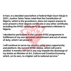 The new Minister of Arts, Culture and Creative Economy, Hannatu Musawa, has reacted to call for her removal as she is currently a serving National Youth Service Corps (NYSC) corps member.