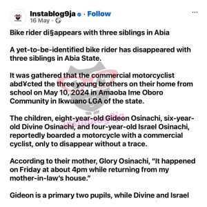 “On May 10, 2024, the Abia State Police Command received a report that three male children, namely: Gideon Osinachi (eight years old), Obioma Divine Osinachi (six years old), and Israel Osinachi (four years old), were abd¥cted by an unknown cyclist from Amoba Okoro village in Ikwuanno LGA of Abia State.