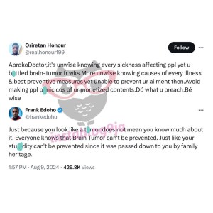 The troll had called out popular Nigerian doctor/influencer, Aproko Doctor on X for always advising people about their health, while he battled brain tumour.