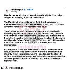 VeryDarkMan has said President Tinubu, under no circumstances should Minister of Interior, Olubunmi Tunji-Ojo, be removed. He has suspended some prison officials in connection with Bobrisky’s case, which shows he’s ready to work for Nigerians. I will protest if he’s removed or replaced,” as he rallies support for Olubunmi Tunji-Ojo, hours after praising him.