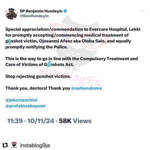 He said special appreciation and commendation to Evercare Hospital, Lekki for promptly accepting/commencing medical treatment of g¥nshot victim, Ojesanmi Afeez aka Oloba Salo, and equally promptly notifying the Police.